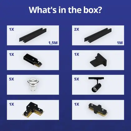 | Herstellername | Complete L shaped 1-Phase Track Set Black incl. 5x Spot fixture + GU10 2700K 3W Dim – 1,5 x 2 meter | |