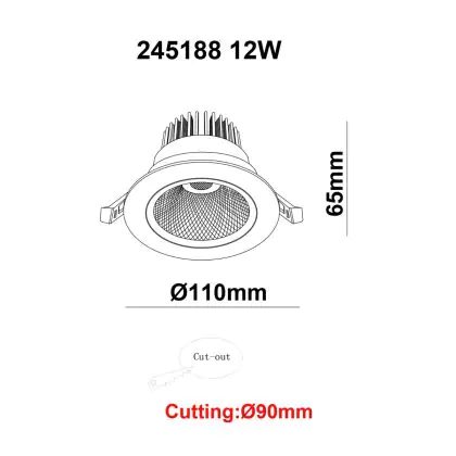 | Herstellername | White label LED Downlight Round Tiltable 12W 960lm 60D 930 UGR19 CutoutØ90mm FrameØ110mm | |