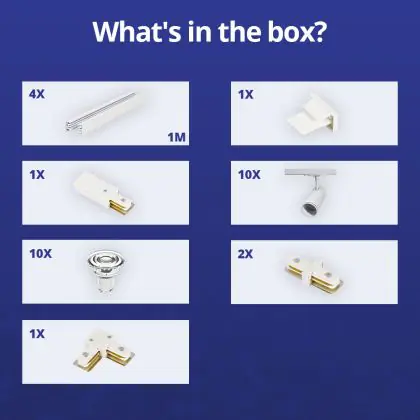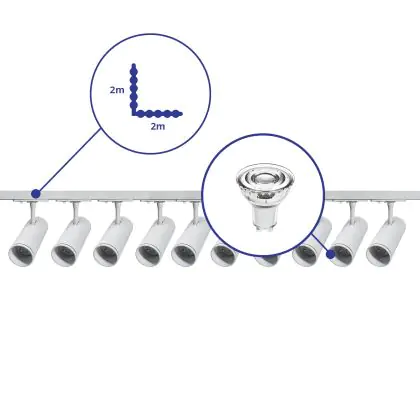 | Nom du fabricant | Complete L shaped 1-Phase Track Set White incl. 10x Spot fixture + GU10 2700K 3W Dim – 2 x 2 meter | |