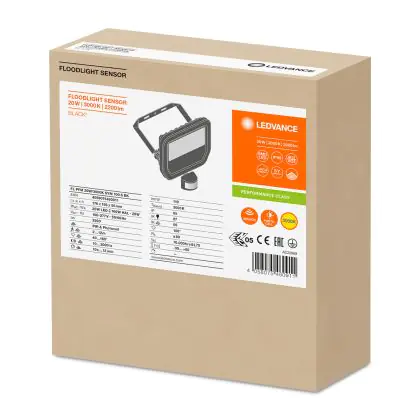 Description Ledvance Projecteur LED Sensor GEN 3 Noir 20W 2200lm 100D - 830 | IP65 - Détecteur de mouvement et de lumière - Symétrique - Remplacement 50W